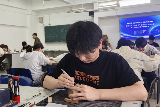 活动伊始,两校美术学院院长分别致辞。惠剑强调:“汉字是中华文明的精神图腾,规范汉字书写和篆刻艺术是文化自信的生动体现。此次协同提质计划下的联合办赛,是美育教学的创新实践。”李林则以“一横一竖写春秋,一撇一捺传文脉”寄语参赛学子,号召大学生在数字时代更要守住汉字书写的文化根脉。简短而隆重的开幕式后,比赛正式开始。