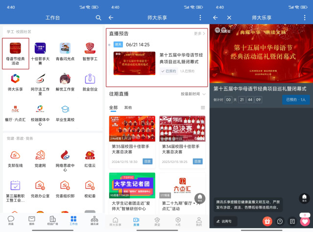 打开手机端或电脑端“爱师大”,进入“工作台”,点击“母语节经典活动”应用,即可观看直播。届时“母语节经典活动”应用也会提前通过“师大乐享”向全校师生推送直播通知